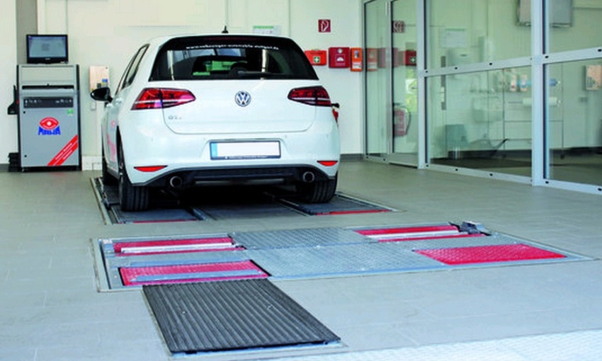 Для проведения теста автомобиль просто проезжает одним колесом по пластине в положении руля прямо.