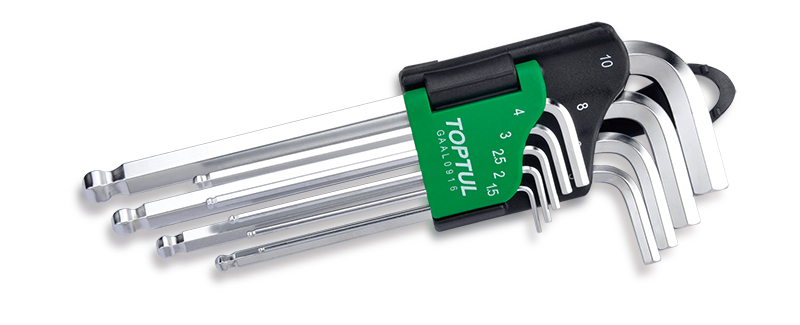 Приобрести Набор шестигранников Г-образных 1,5-10 мм, длинные с шаром, 9 предметов TOPTUL от компании Toptul (Тайвань) из раздела Шестигранные Г-образные ключи по цене 1 753 рублей.